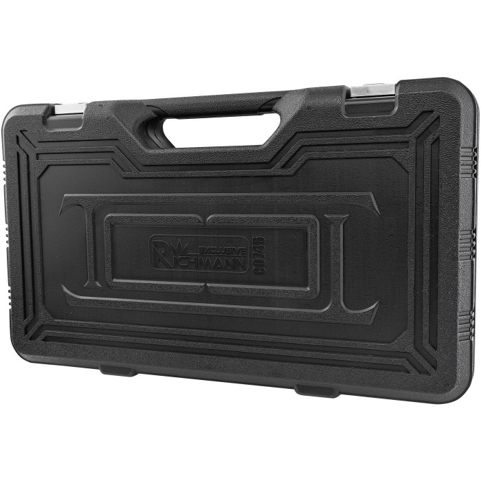 Zestaw umieszczony w walizce transportowej z przyporządkowanymi miejscami na każdy element.