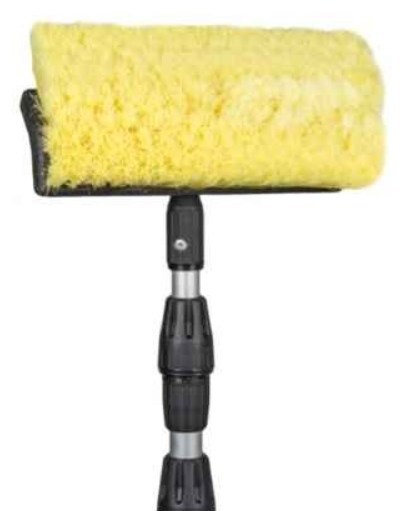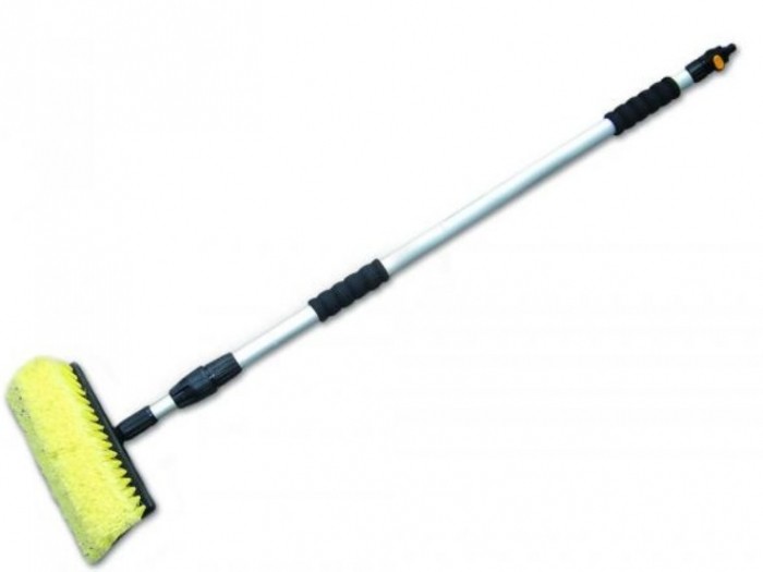 Duża i wygodna szczotka z teleskopowym aluminiowym trzonkiem (od 100 do 170cm). Wyposażona w przełącznik przepływu wody oraz wyprofilowany uchwyt zakończony nyplem. Posiada dwie płaszczyzny gęstego włosia z miękkich włókien (końcówki rozdwajane), które nie niszczą powłok lakieru. Idealnie nadaje się do mycia samochodów ciężarowych, łodzi i autokarów. Włosie odporne na działanie środków myjących.