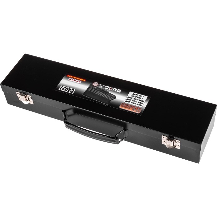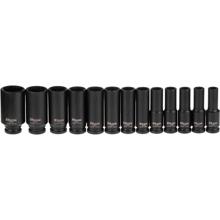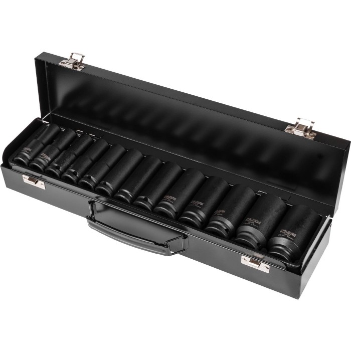Zestaw 13 sztuk nasadek udarowych sześciokątnych długich ½” w zakresie rozmiarów 10 - 30 mm umieszczonych w metalowej walizce transportowej.