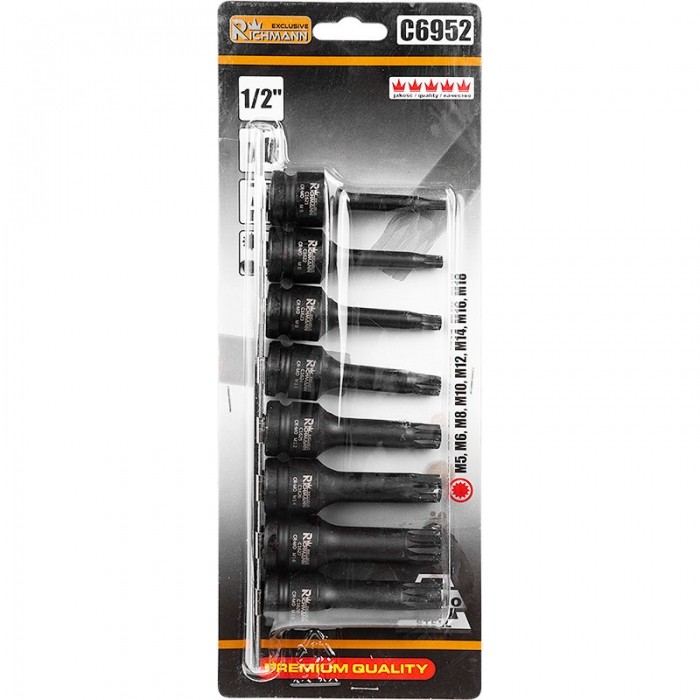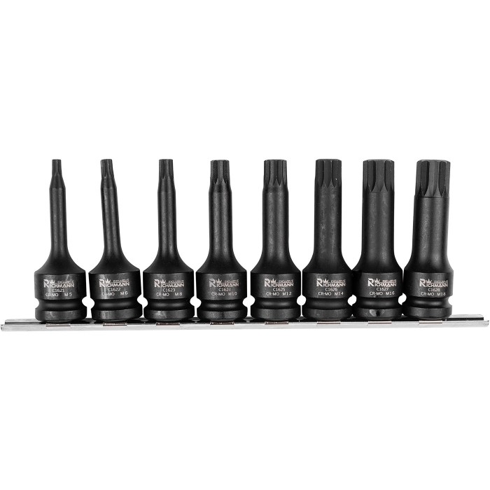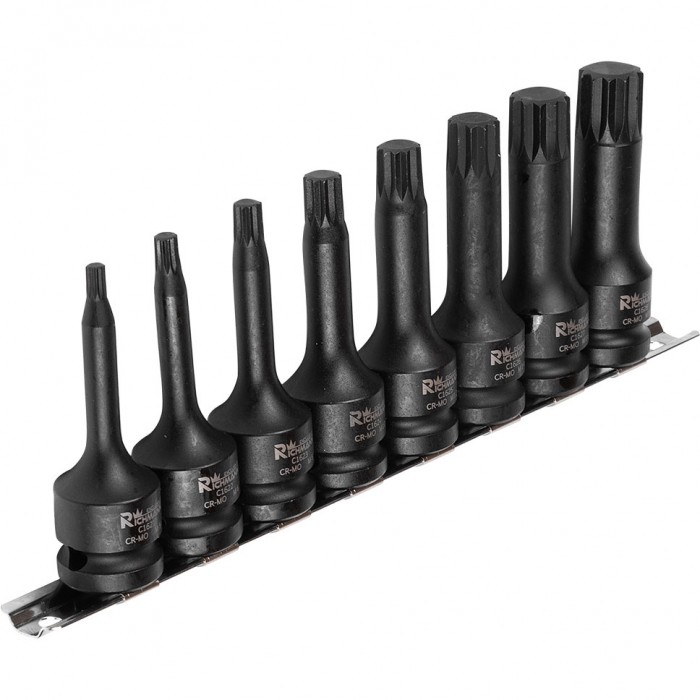 Zestaw 8 sztuk nasadek udarowych SPLINE ½” w zakresie rozmiarów M5-M18 umieszczonych na metalowej listwie.