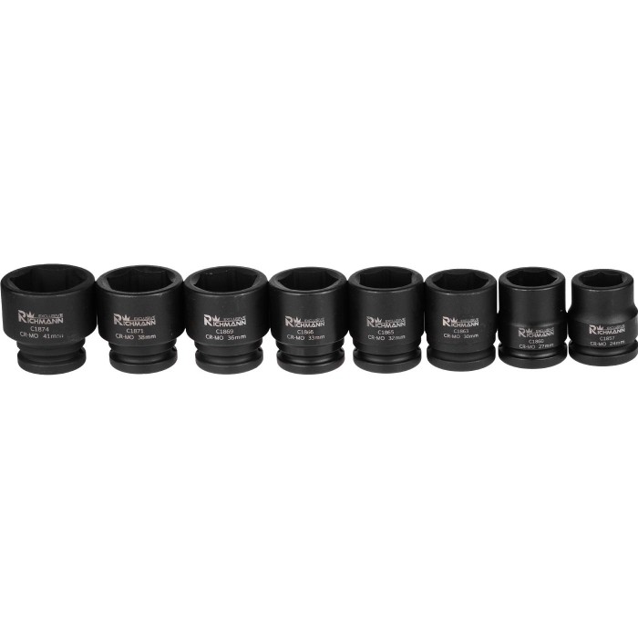 Zestaw 8 sztuk nasadek sześciokątnych ¾” w zakresie rozmiarów 24-41 mm umieszczonych w metalowej walizce transportowej.
