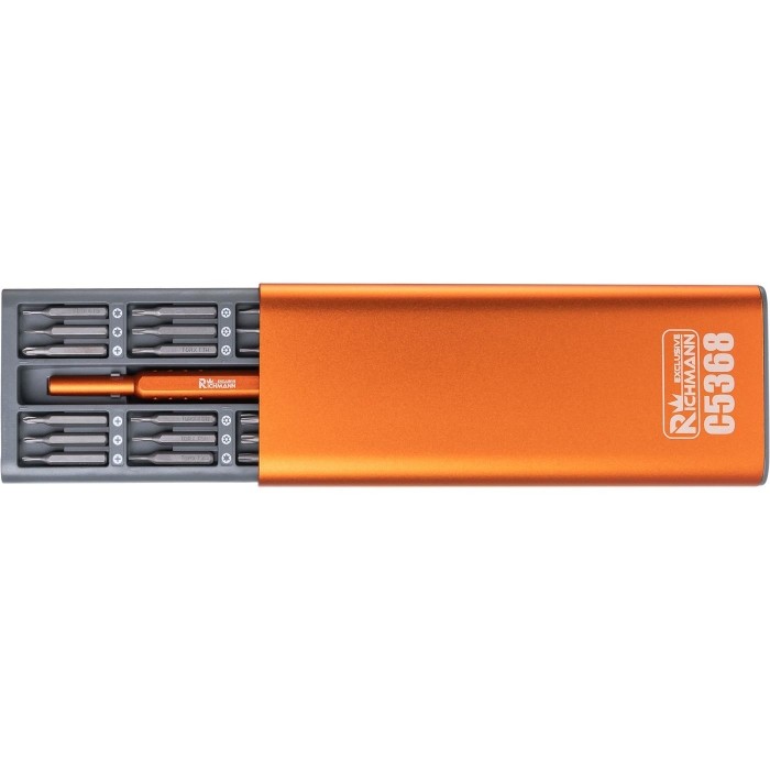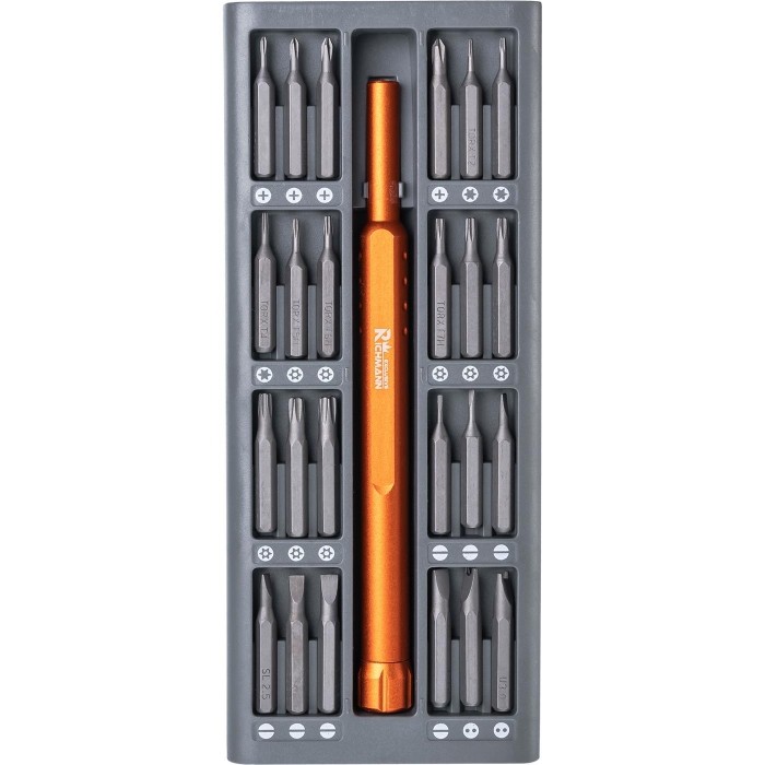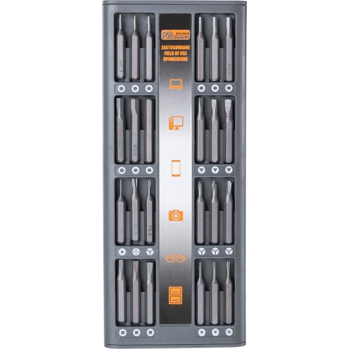 Wkrętak precyzyjny z wymiennymi końcówkami.W zestawie znajduję się 48 bitów, które sprawdzą się w wielu pracach serwisowych oraz przy elektronice.Zawiera wszystkie cechy wkrętaków precyzyjnych z najwyższych półek takie jak np. wygodna, rotacyjna końcówka uchwytu.Został zaprojektowany do naprawy m.in.: telefonów, tabletów, nawigacji, kamer, laptopów i wszystkich innych urządzeń gdzie liczy się precyzja.Wykonane ze stali S2 o lepszych właściwościach niż stal CrV czy CrMo z dodatkowym zabezpieczeniem antykorozyjnym.Dwustronne magnetyczne opakowanie zbiorcze posiada przypisane miejsce na każdą końcówkę jednocześnie zapobiegając przemieszczaniu się podczas transportu.Aluminiowa obudowa zewnętrzna gwarantuje ochronę przed korozją, niską wagę, oraz wytrzymałe zabezpieczenie podczas transportowania.Kształt oraz wymiar opakowania umożliwia umieszczenie w większości kieszeni. ZESTAW ZAWIERA: Wkrętak z gniazdem 126 mmPhillips: PH000, PH00, PH0, PH0, PH1Torx: T2, T3, T4, T5, T6, T7Torx z zabezpieczeniem: T8H, T9H, T10H, T15H, T20HPłaskie: 1.0, 1.5, 2.0, 2.5, 3.0, 3.5, 4.0Spanner: U2.6, U3.0Hex: H0.7, H0.9, H0.7, H1.3, H1.5, H2.0, H2.5, H3.5, H4.0Trójkąt: 2.0, 2.3, 3.0Okrągły: 0.8Krzyżakowy z zabezpieczeniem: 2.5Tri-wing: Y0.6, Y1, Y2.0, Y2.5Czworokątne: S0, S1, S2Gwiazdkowe: 0.8, 1.2, 1.5 DANE TECHNICZNE: Rodzaj: Wkrętak z wymiennymi końcówkamiElementów w zestawie [szt.]: 49Stal: S2Wymiary opakowania [mm]: 170 x 70 x 20Waga [kg]: 0.270