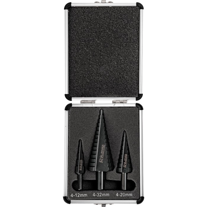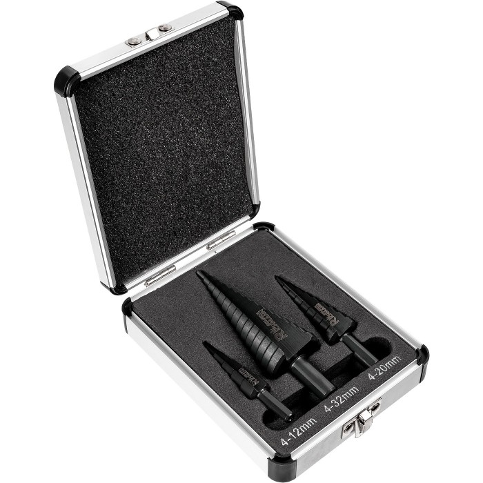 Profesjonalny zestaw 3 wierteł stopniowych w metalowej kasecie.