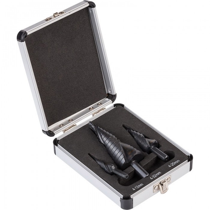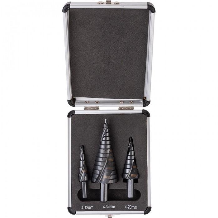 Zestaw 3 szt. wierteł stopniowych przeznaczonych do wiercenia otworów w stali w zakresie rozmiarów 4-12 mm, 4-20 mm, 4-32 mm. Zastosowanie w materiałach takich jak: metale nieżelazne, blachy stalowe cienkościenne, tworzywa sztuczne. Wykonane ze stali szybkotnącej HSS z podwyższoną zdolnością skrawającą w bardzo ciężkich warunkach, przy dużych prędkościach i wysokim współczynniku tarcia . Pokryte tytanową powłoką. Uchwyt cylindryczny. Zestaw umieszczony w aluminiowej kasecie transportowej z miękkim wkładem i przeznaczonym miejscem na każde wiertło. Jakość przemysłowa. ZESTAW ZAWIERA: