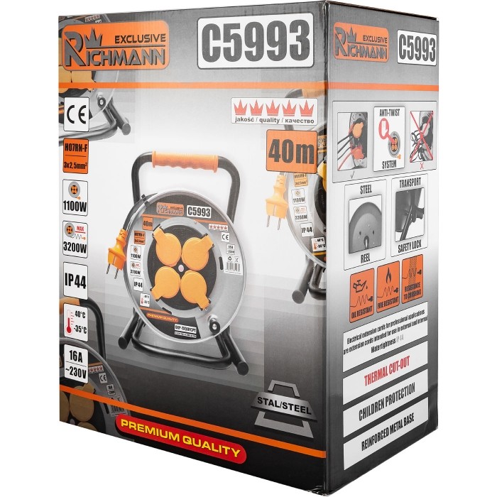 Podczas zwijania gniazda pozostają nieruchome, co zapobiega zaplątaniu przewodów podłączonych urządzeń podczas zwijania.
