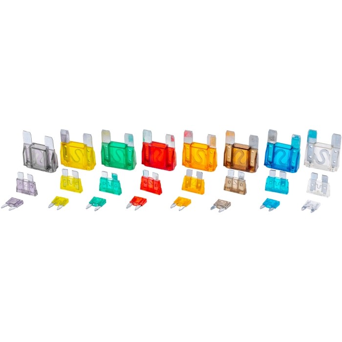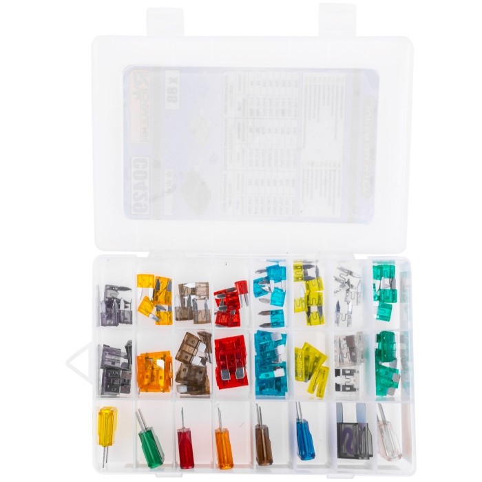 Zestaw zawiera wszystkie najpopularniejsze rozmiary bezpieczników stosowanych między innymi w warsztatach samochodowych.