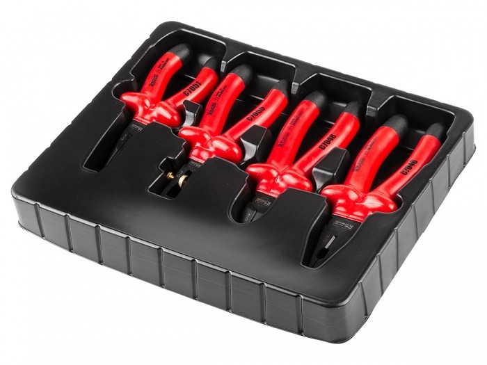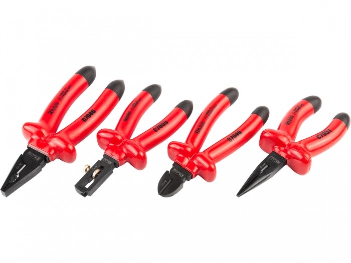 Zestaw 4 sztuk izolowanych szczypiec oraz ściągacz do izolacji.
