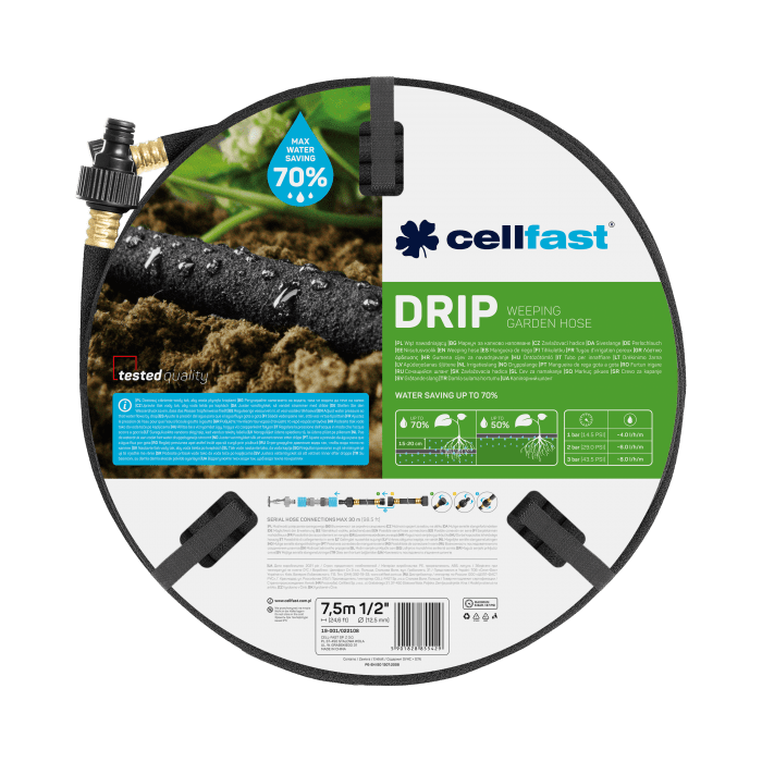 • wąż do oszczędnego i precyzyjnego nawadniania roślin • oszczędza do 70% wody na skutek wyeliminowania efektu parowania • wąż może być poprowadzony na lub pod powierzchnią gruntu (zalecana głębokość 15-20 cm) • zużycie wody w zależności od ciśnienia roboczego 3 bar - 6,8 ÷ 7,2 l/h/mb; 2 bar - 5,6 ÷ 6,4 l/h/mb; 1 bar - 0,4 ÷ 5 l/h/mb • może funkcjonować przy bardzo niskim ciśnieniu wody • zamontowane końcówki służą do szybkiego podłączenia węża • najlepiej sprawdza się przy nawadnianiu roślin rosnących w skupiskach (żywopłoty, rabaty kwiatowe, skalniaki, warzywniki) • możliwość połączenia szeregowego maksymalnie 30 m