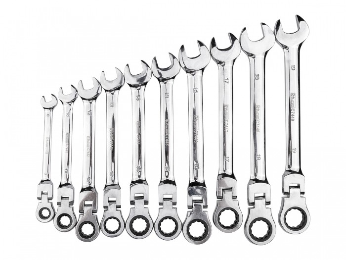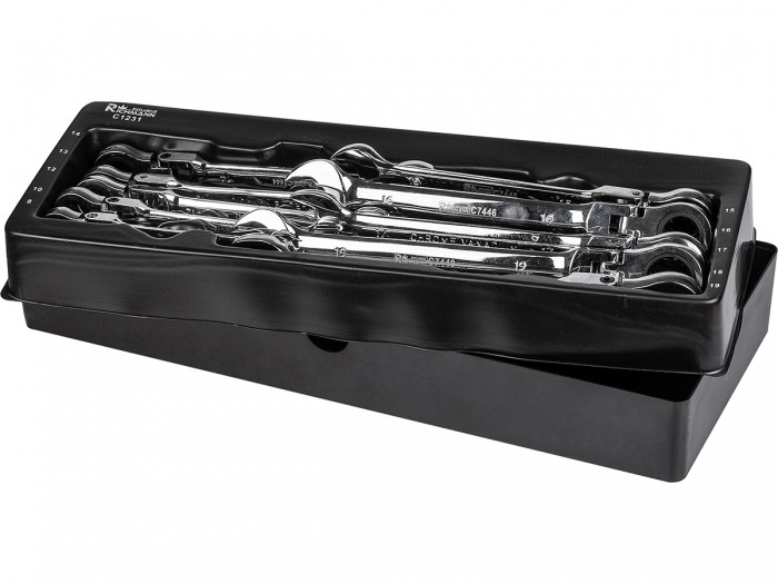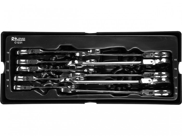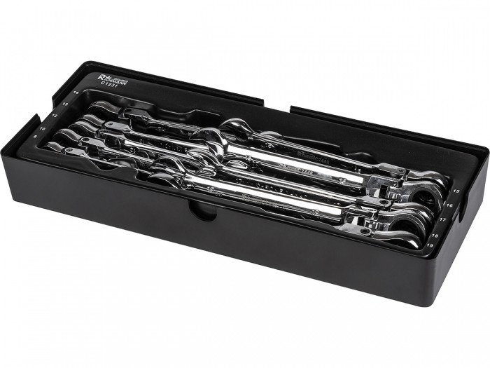 Zestaw 10 sztuk łamanych kluczy płasko-oczkowych z grzechotką umieszczonych we wkładzie do wózka warsztatowego typu A.