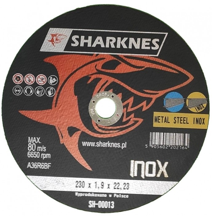 Tarcza Sharknes do cięcia stali, przeznaczona do montażu na szlifierkach kątowych, posiada otwór wewnętrzny 22.2 mm co pozwala na montaż na większości szlifierek. Materiał wysokiej jakości użyty przy produkcji tarczy zwiększa wydajność i żywotność produktu. Ścierniwo jest wiązane żywicą syntetyczną i wzmacniane tkaniną z włókna szklanego.