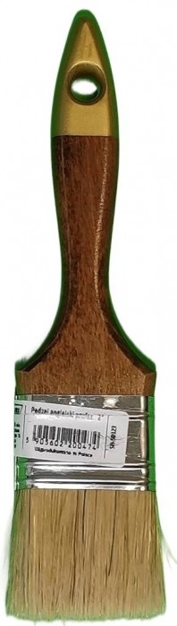 Włos wykonany z mieszanki szczeciny naturalnej i włókna x-shape, bukowy wyprofilowany trzonek zapewnia pewny chwyt, skuwka została wykonana ze stali niklowanej. Trzonek pędzla posiada otwór do zawieszenia na tablicy narzędziowej. Zalecany do wszystkich rodzajów farb i lakierów.