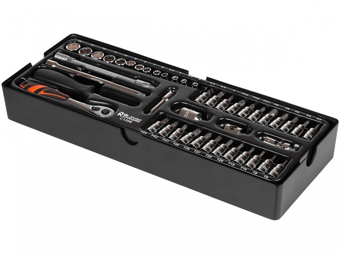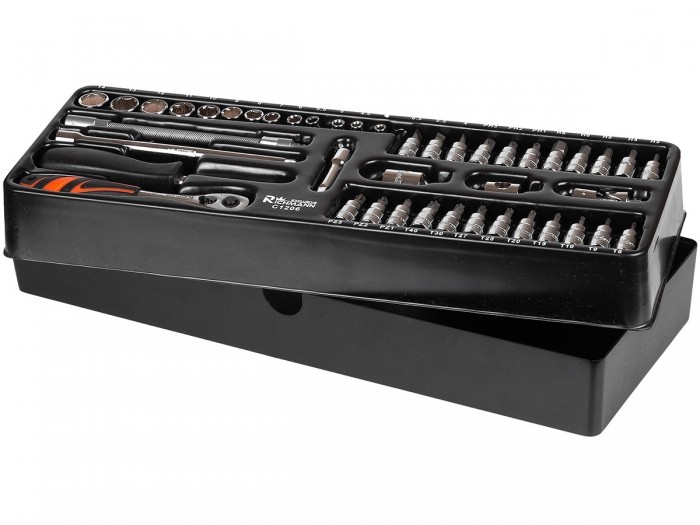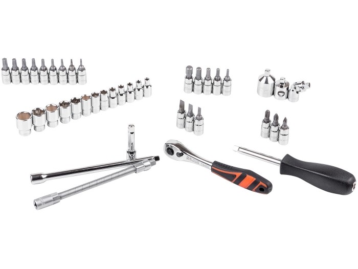 Zestaw 44 elementów, w tym bity, nasadki wraz z akcesorami.