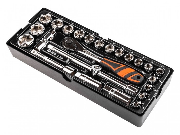 Zestaw 25 elementów, w tym nasadki wraz z akcesorami.