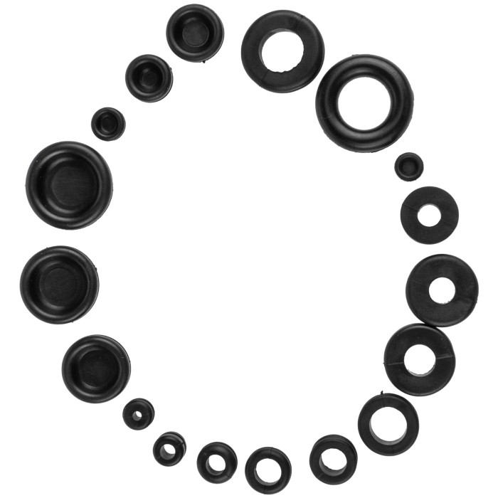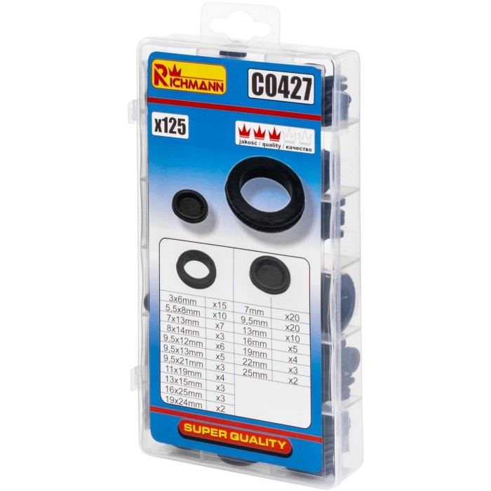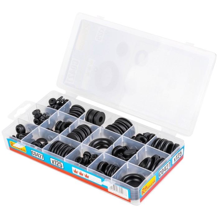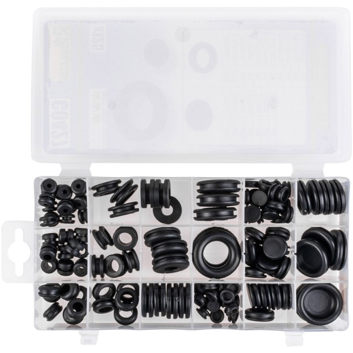 Zestaw 127 sztuk podkładek gumowych z zatyczkami. W komplecie znajdują się wszystkie najpopularniejsze rozmiary gum przelotowych z rowkiem oraz zatyczek stosowanych w zakładach i warsztatach. Komplet umieszczony w kasecie zamykanej na zatrzaski z oczkiem do zawieszenia na haku np. w warsztacie. Każdy rozmiar ma oddzielną przegródkę w opakowaniu zbiorczym co zapobiega przemieszaniu się podczas transportu. ZESTAW ZAWIERA: Podkładki gumowe z rowkiem: