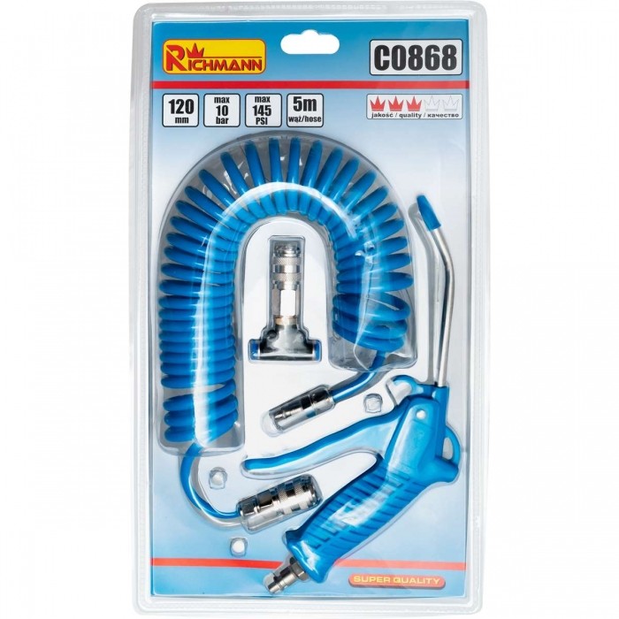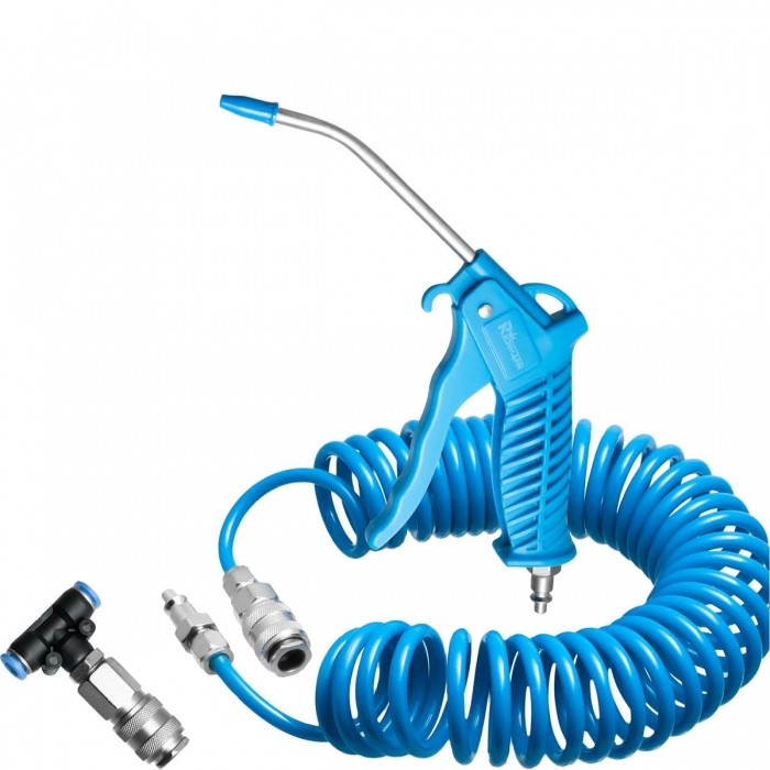 Pistolet do przedmuchiwania z dyszą 120 mm, wężem spiralnym o długości 5 m oraz trójnikiem 6 mm.