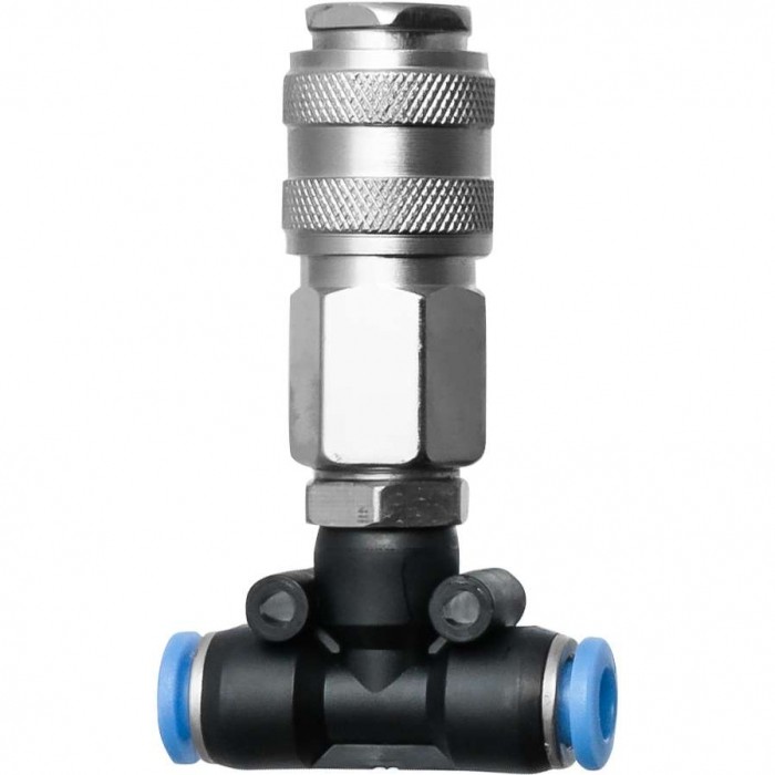 Zakończony szybkozłączką umożliwiającą przyłączenie do niego narzędzi pneumatycznych takich jak np.: manometr, pistolet do przedmuchiwania, pistolet lakierniczy, ropownice, klucz pneumatyczny, smarownicę itp..