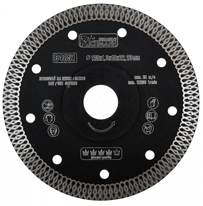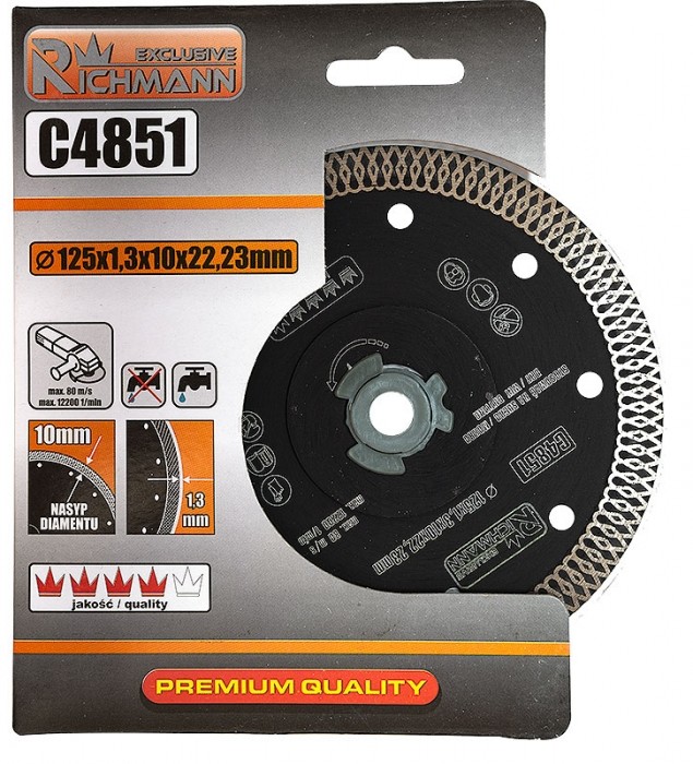 Średnica tarczy wynosi: 125 mm, grubość: 1,3 mm, otwór: 22,23 mm, powierzchnia diamentowa 10 mm.