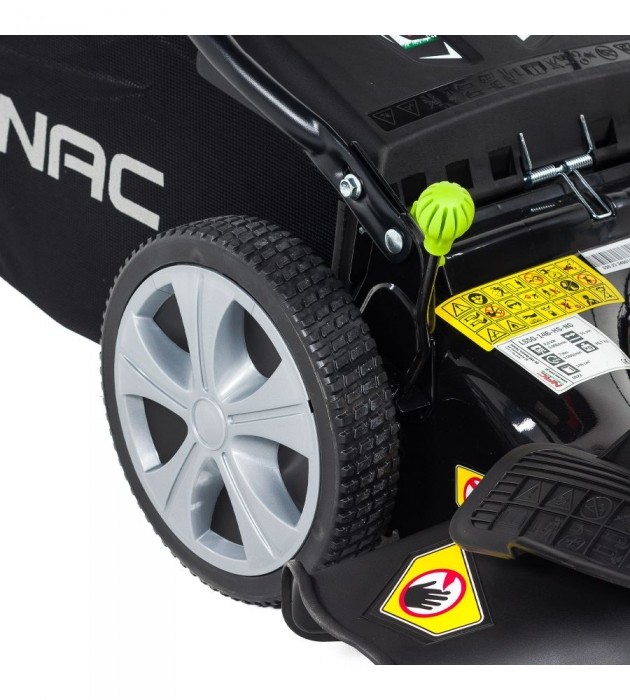 Duże łożyskowane tylne koła o średnicy 25 cm zmniejszają opory toczenia i ułatwiają prowadzenie kosiarki. Średnicy kół przednich 18 cm.