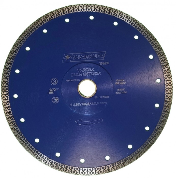 Tarcza Sharknes do cięcia gresu i ceramiki, przeznaczona do montażu na szlifierkach kątowych, posiada otwór wewnętrzny 22.2 mm co pozwala na montaż na większości szlifierek.