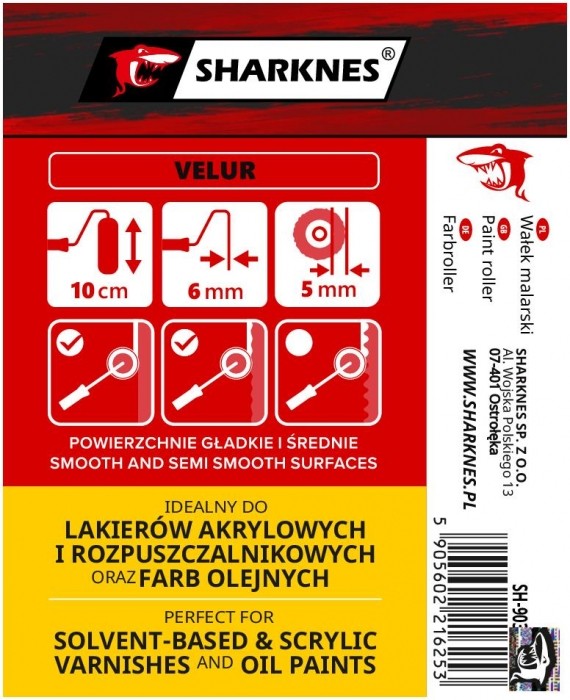 Wałek Sharknes Velur przeznaczony jest do malowania lakierami akrylowymi, rozpuszczalnikowymi oraz farbami olejnymi.