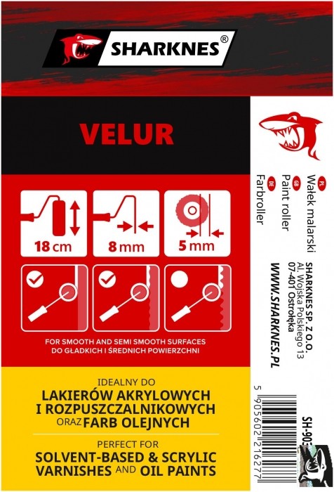 Wałek Sharknes Velur przeznaczony jest do malowania lakierami akrylowymi, rozpuszczalnikowymi oraz farbami olejnymi.