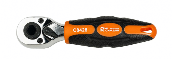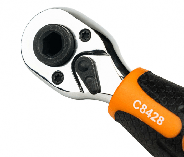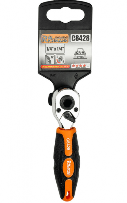 Dwukierunkowa grzechotka powlekana, wykonana ze stali chromowo-wanadowej (CR-V) wyposażona w uchwyt na nasadki 1/4" oraz bity 1/4". Zastosowany chrom gwarantuje odporność stali na korozję, utlenianie, ścieranie i dużą wytrzymałość w wysokiej temperaturze, zaś dodatek wanadu również wpływa na odporność na działanie wysokich temperatur oraz nieuleganie deformacjom. Mechanizm zapadkowy grzechotki wyposażony w 72 zęby. Klucz wyposażony w przełącznik kierunkowy lewo-prawo. Zakończona otworem do zawieszenia na haku np. w warsztacie. Ergonomiczny, antypoślizgowy, gumowany uchwyt ułatwiający pracę podczas dokręcania. Kompaktowe rozmiary.
