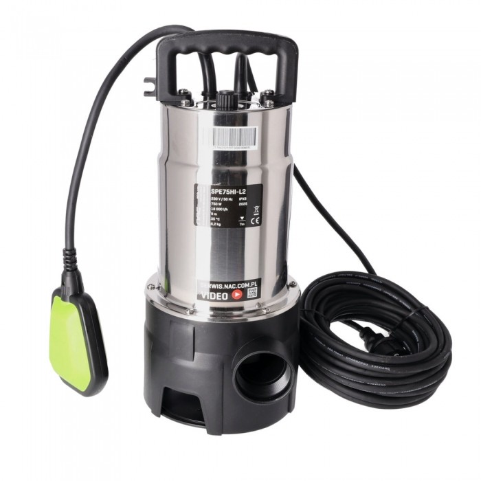 Pompy zatapialne NAC serii SPE75HI-L2 zaprojektowano do szybkiego przepompowywania wody brudnej z oczek wodnych, beczek, przydomowych zbiorników oraz zalanych pomieszczeń. Silnik o mocy 750 W zapewnia wysoką wydajność do 18 000 l/h, dzięki czemu sprawnie usuwa nawet większe ilości wody.