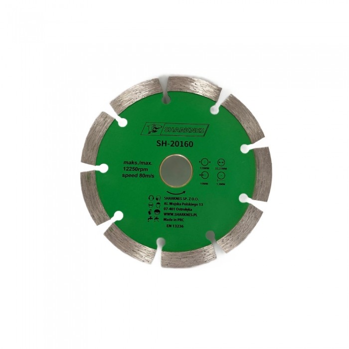 SHARKNES TARCZA DIAMENTOWA SEGMENTOWA 125x10x22,23 mm to trwałe i wydajne narzędzie przeznaczone do cięcia betonu, cegły, pustaków oraz materiałów murarskich.