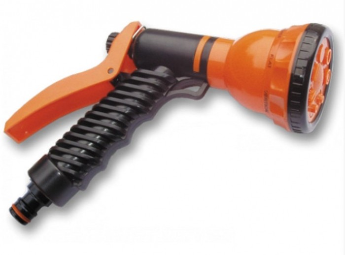 Pistolet 7-funkcyjny plastikowy pozwala podlewać różnymi strumieniami wody: od skoncentrowanego strumienia do rozproszonej mgiełki. Wyposażony w dźwignię do regulacji siły strumienia wody.