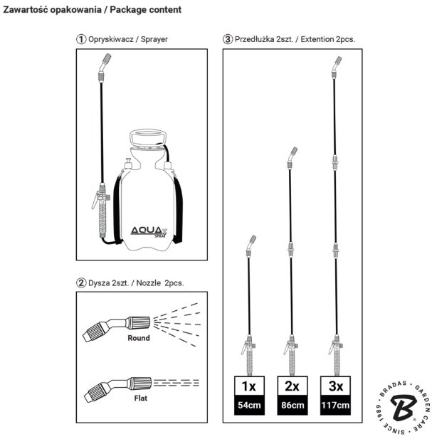 Wyjątkowe funkcje: - ergonomiczny uchwyt do przenoszenia - szeroki lejek zapobiega rozlaniu cieczy przy nalewaniu oraz ułatwia czyszczenie zbiornika - półprzezroczysty zbiornik wykonany z wysokiej gestości PE jest lekki, mocny i trwały - długa żywotność tłoka - unikalna konstrukcja wysoko efektywnej pompy gwarantuje bezawaryjną pracę - regulowany pasek dla większego komfortu użytkownika - bezpieczna praca dzięki zaworowi ciśnienia - przełącznik zaworu pozwala włączać i wyłączać opryskiwacz za pomoca palca. Możliwość blokady zaworu - lanca z możliwością złożenia na trzy długości: 54 cm, 86 cm, 117 cm - dwie wymienne dysze : ROUND, FLAT.